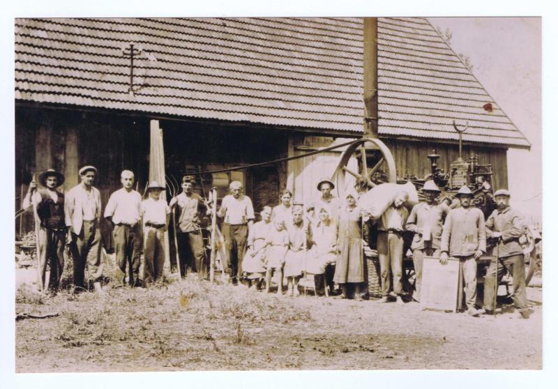 Dampfdreschen, der „Abtrager“ musste die schweren Säcke mit dem Getreide oft weit über Treppen auf den Dachboden tragen.