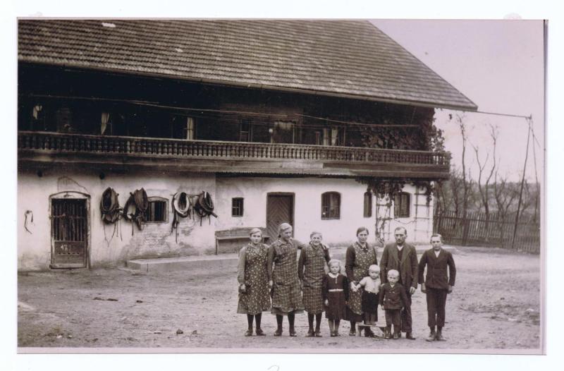 Ein typisches Bauernhaus mit langem Schrot und den „Pferdekummeten“ an der Stallmauer in der Gemeinde mit der Mehrgenerationenfamilie v. l. Gamsreiter Maria (Pfaffing), Knab (spätere Freundorfer) Franziska, Knab (Kirschner) Maria, Hofbauer (Salzberger) Anna, Hofbauer Franziska, Hofbauer Hans (auf Stuhl), Hofbauer Otto , Hofbauer Otto (Kind), Knab Ludwig