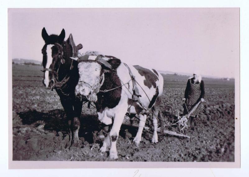 Auch die Frauen mussten schwer arbeiten beim Ackern. Oft wurde ein Ochse und ein Pferd zusammengespannt.