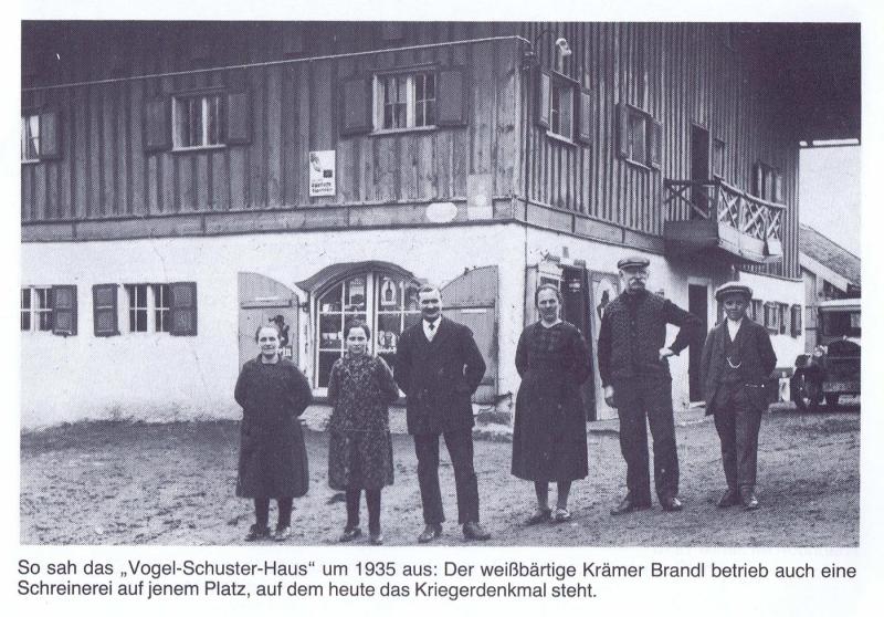 1935 So sah das "Vogel-Schuster-Haus" um 1935 aus: Der weißbärtige Krämer Brandl betrieb auch eine Schreinerei auf jenem Platz, auf dem heute das Kriegerdenkmal steht.